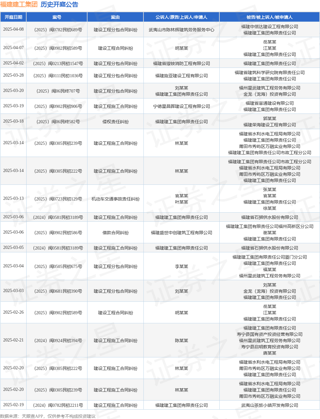 本站消息,根据天眼查APP显示,近日公布了一则福建建工集团有限责任公司作为被告/被上诉人的开庭公告,详细内容如下: